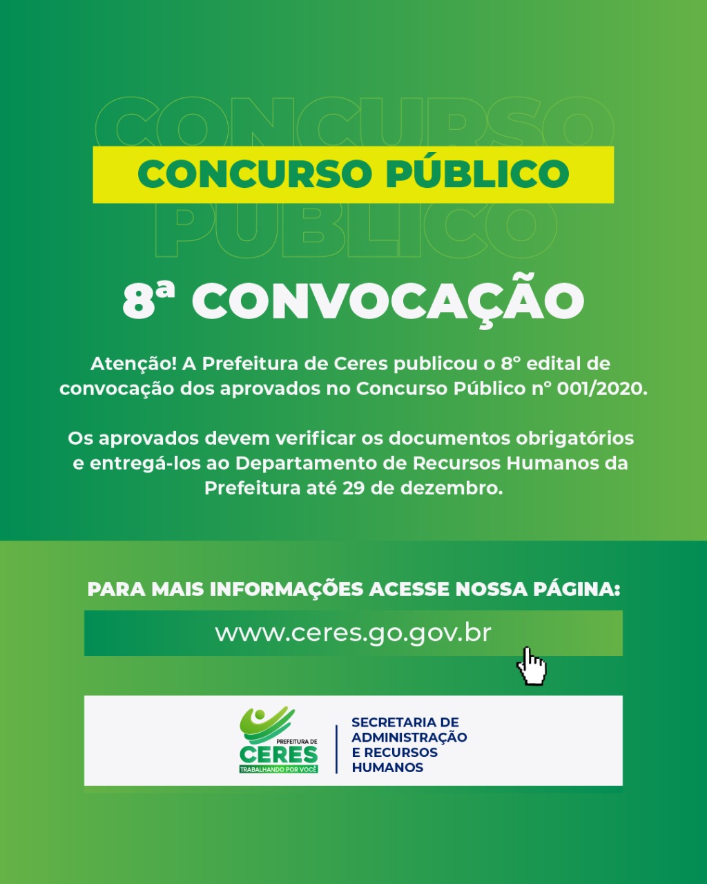 A Prefeitura de Ceres divulgou na última terça-feira, 29 de novembro, o oitavo edital de convocação de aprovados no Concurso Público n° 01/2020, realizado em 12 de dezembro de 2021. Os candidatos convocados deverão, em até 30 dias da convocação, apresentar no Departamento de Recursos Humanos da Prefeitura os documentos listados no item 1 do edital, sob pena de perda do direito à vaga.